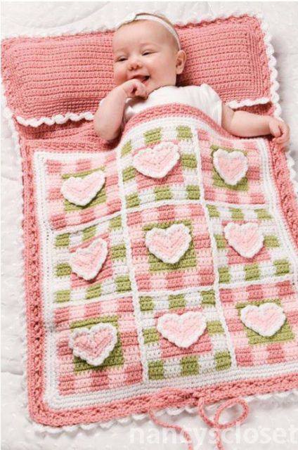 Anasayfa » Bebeklerinizi Sıcacık Tutacak Örgü Battaniyeler » şık tığ işi kalpli bebek battaniye takımı