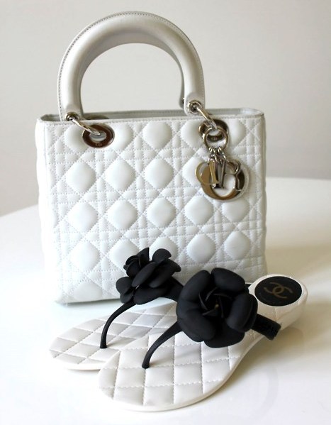 beyaz rugan çanta ve siyah güllü beyaz terlik kombini