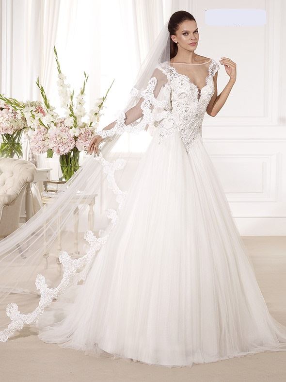 çok şık işlemeli kabarık duvaklı gelinlik modeli