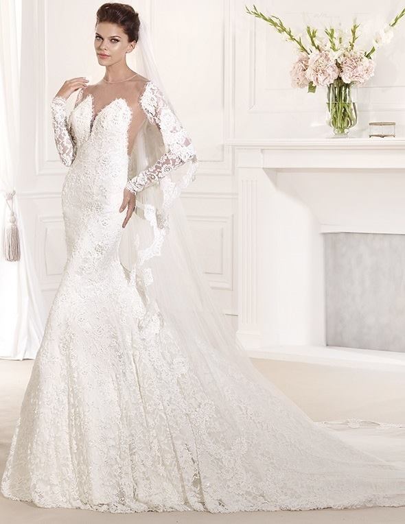 dantel işlemeli duvaklı kuyruklu gelinlik modelleri