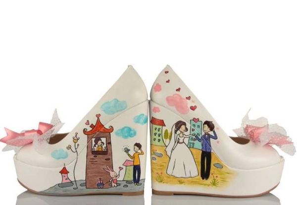 dolgu topuklu beyaz gelin damat desenli gelin ayakkabısı