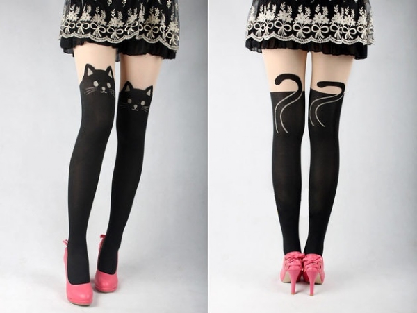 Kedi desenli diz üstü bayan çorapları