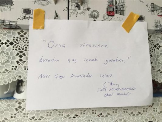 Okul Müdürü Salih Niyazibeyoğlu tarafından ‘alınan karar’la okulda bulunan öğretmenlerin öğretmenler odasından çay içmeleri oruç süresince yasaklandı. Öğretmenler bu duruma tepki gösterdi. Çaylarımızı evimizden getiririz diyen öğretmenlere okul müdürü hakaretlerle karşılık verdi ve çayların alındığı yere bir yazı astı. Yazıda yer alan ifadeler ise Müdür Niyazibeoğlu’nun amacını gözler önüne serer nitelikte: