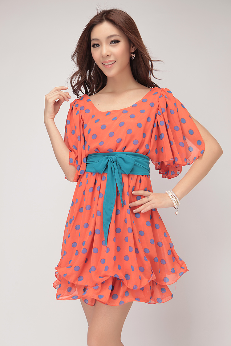 Puantiyeli kuşaklı fiyonklu yazlık elbise modeli