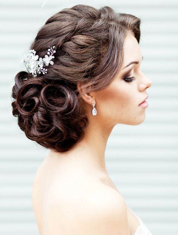 siyah saça uygulanmış dağınık topuz ve aksesuarlı gelin başı