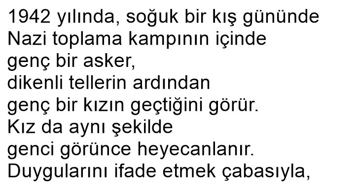 1942 yılında, soğuk bir kış gününde Nazi toplama kampının içinde genç bir asker, dikenli tellerin ardından genç bir kızın geçtiğini görür. Kız da aynı şekilde genci görünce heyecanlanır. Duygularını ifade etmek çabasıyla,